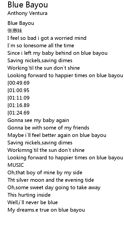 | [00:41.69] | Looking forward to happier times on blue bayou |