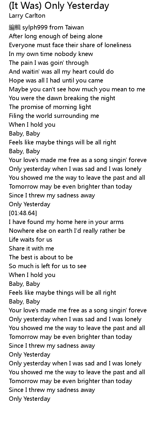 | [01:15.69] | Only yesterday when I was sad and I was lonely |