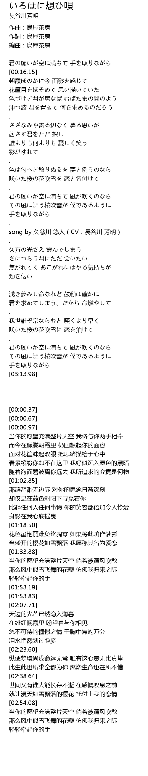 | [01:18.60] | 色は匂へど散りぬるを 夢と例うのなら |