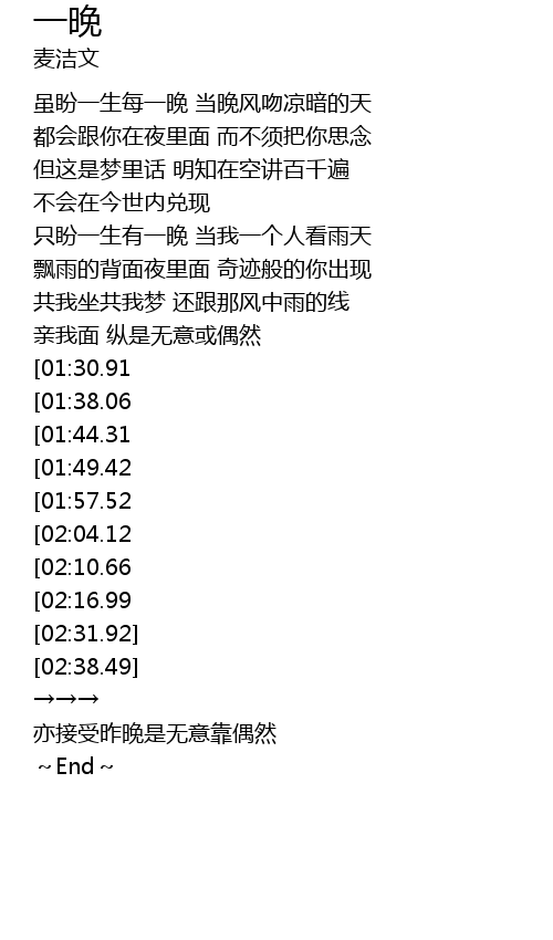 | [00:39.06] | 虽盼一生每一晚 当晚风吻凉暗的天 |