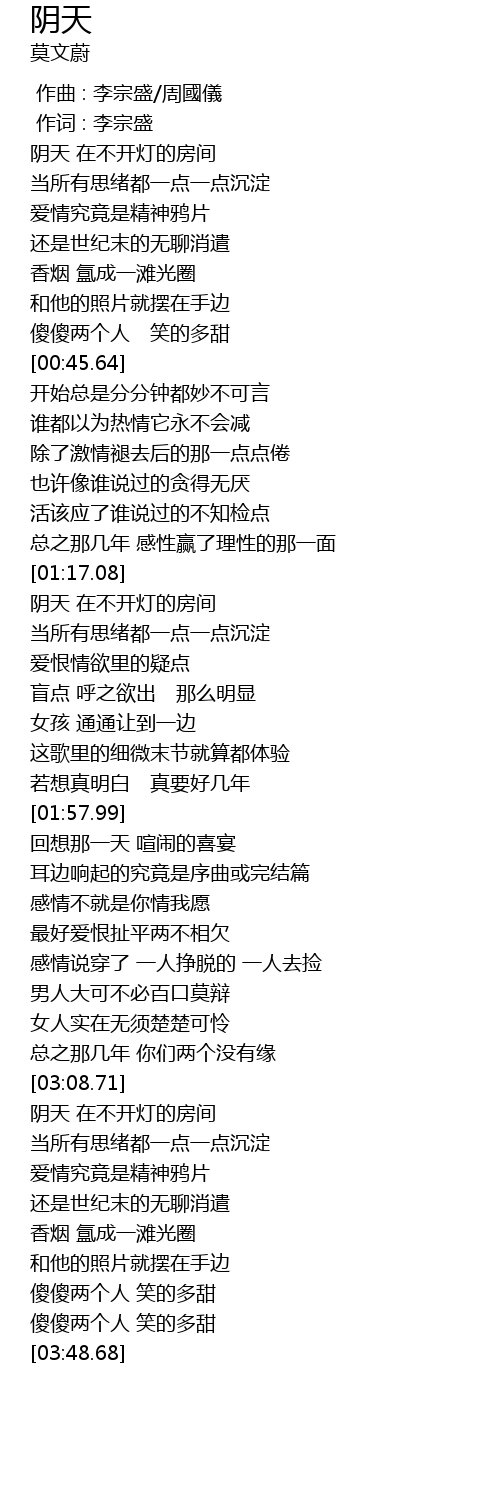 | [01:32.02] | 阴天 在不开灯的房间 |
