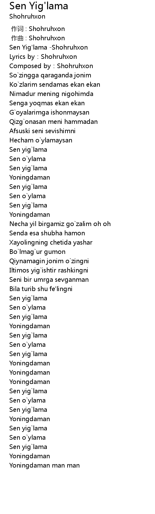 | [00:00.509] | Sen Yig' lama Shohruhxon |