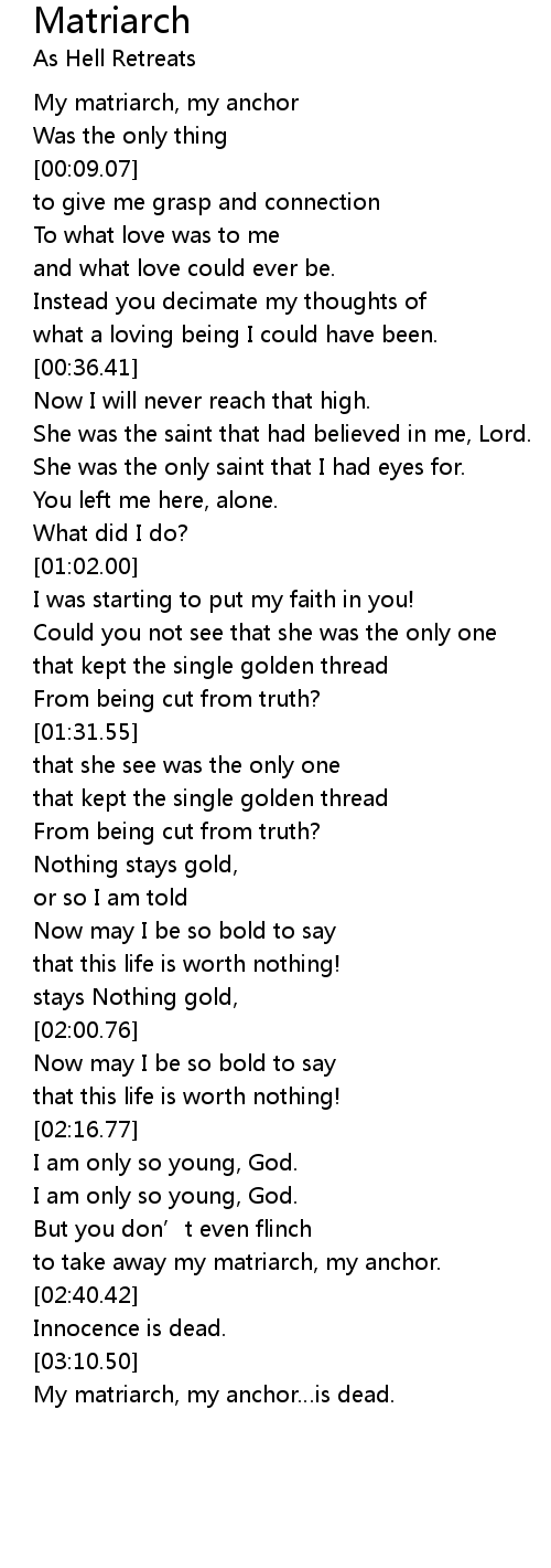 | [03:20.54] | My matriarch, my anchor is dead. |