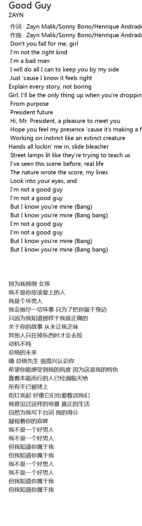 | [00:01.000] | zuò qǔ : Zayn Malik Sonny Bono Henrique Andrade Alexandre Bursztyn |