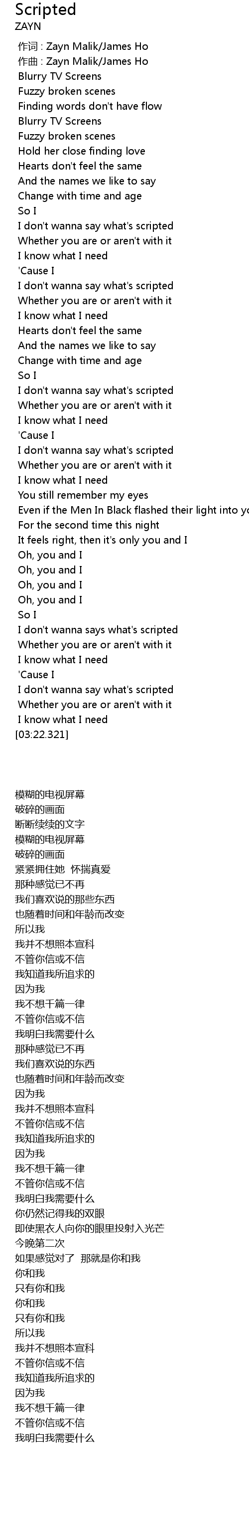| [00:00.000] | 作词 : Zayn Malik/James Ho |