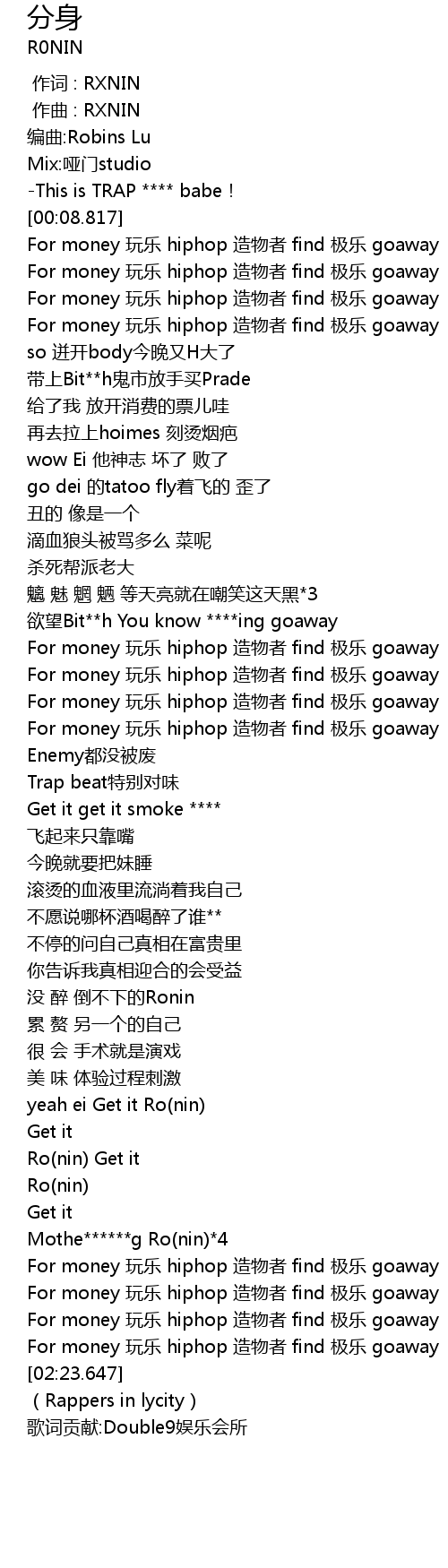 | [02:18.996] | For money 玩乐 hiphop 造物者 find 极乐 goaway |