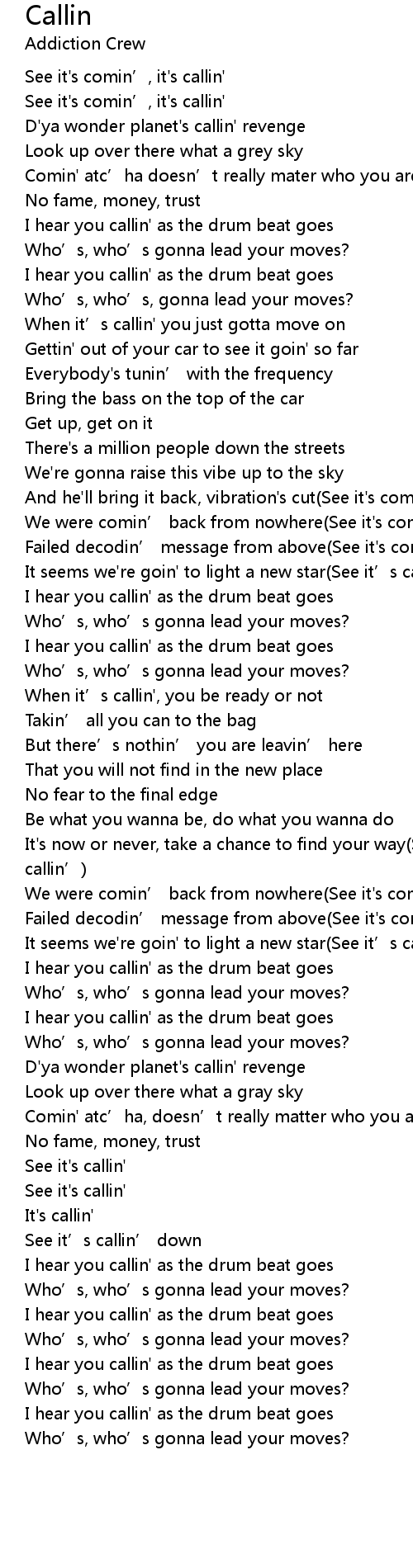 | See it's comin’, it's callin' | |