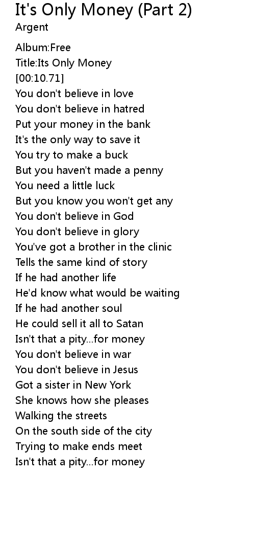 | [00:09.36] | Title:Its Only Money |