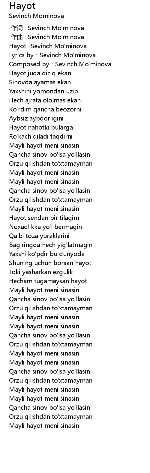 | [00:00.00] | Hayot -Sevinch Mo'minova |