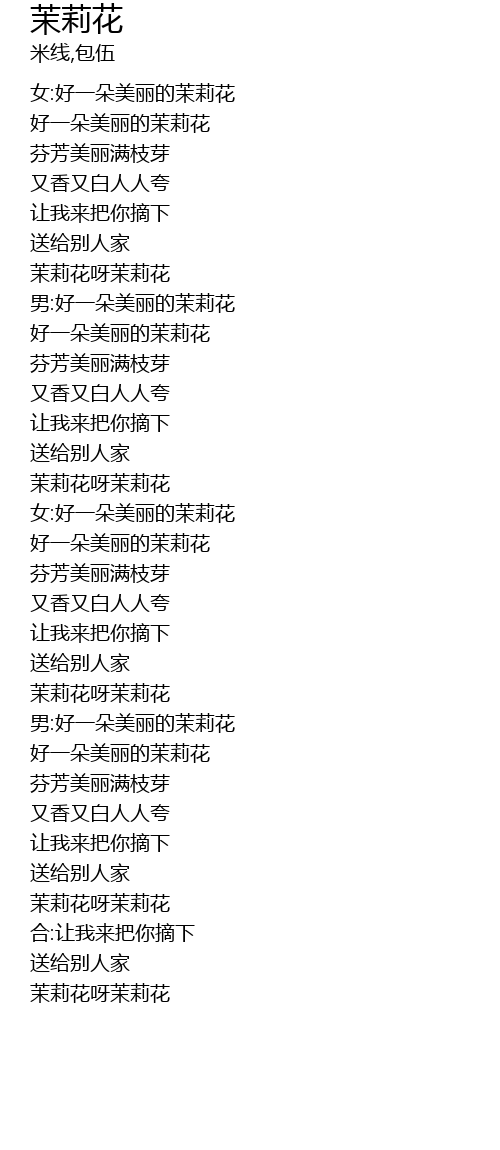 | [00:18.840] | 女:好一朵美丽的茉莉花 |