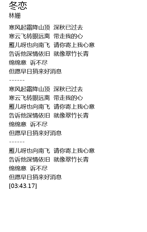 | [02:59.29] | 雁儿呀也向南飞 请你寄上我心意 |