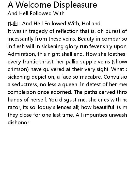 | It was in tragedy of reflection that is, oh purest of nights was to drink incessantly from these veins. Beauty in comparison to no other. A standard made in flesh will in sickening glory run feverishly upon the razor' s edge. Admiration, this night shall end. How she loathes the sight of herself. And with every frantic thrust, her pallid supple veins showered in orgasmic tides of crimson have quivered at their very sight. What once was desired is now a mere sickening depiction, a face so macabre. Convulsions induced by vomiting. No more a seductress, no less a queen. In detest of her mere reflection, her youthful complexion once adorned. The paths carved through arterial fabrication at the hands of herself. You disgust me, she cries with hoarseness in her throat. The razor, its soliloquy silences all how beautiful its merciless sway. Her eyes, they close for one last time. All impurities unwashed in this filth and dishonor. |