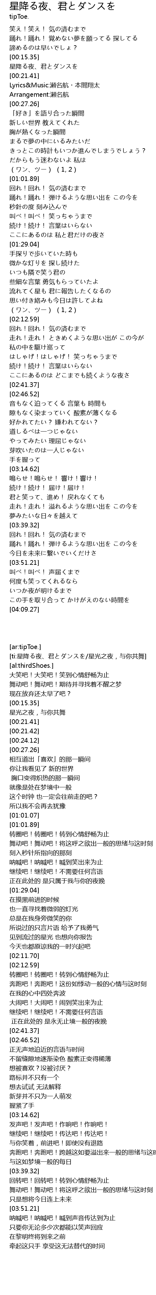 | [00:15.36] | 星降る夜、君とダンスを |