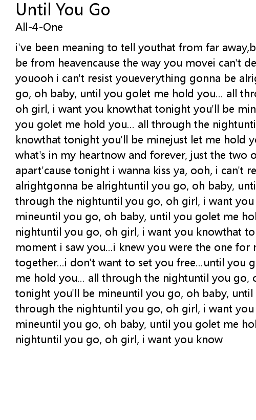 | i've been meaning to tell youthat from far away,baby you caught my eyeyou must be from heavencause the way you movei can't deny that tonight i want to kiss youooh i can't resist youeverything gonna be alright-gonna be alrightuntil you go, oh baby, until you golet me hold you... all through the nightuntil you go, oh girl, i want you knowthat tonight you'll be mineuntil you go, oh baby, until you golet me hold you... all through the nightuntil you go, oh girl, i want you knowthat tonight you'll be minejust let me hold youlet me find away to show you what's in my heartnow and forever, just the two of usand we'll never be apart'cause tonight i wanna kiss ya, ooh, i can't resist yaeverything gonna be alrightgonna be alrightuntil you go, oh baby, until you golet me hold you... all through the nightuntil you go, oh girl, i want you knowthat tonight you'll be mineuntil you go, oh baby, until you golet me hold you... all through the nightuntil you go, oh girl, i want you knowthat tonight you'll be minefrom the moment i saw you...i knew you were the one for meand know that we are together...i don't want to set you free...until you go, oh baby, until you golet me hold you... all through the nightuntil you go, oh girl, i want you knowthat tonight you'll be mineuntil you go, oh baby, until you golet me hold you... all through the nightuntil you go, oh girl, i want you knowthat tonight you'll be mineuntil you go, oh baby, until you golet me hold you... all through the nightuntil you go, oh girl, i want you know |