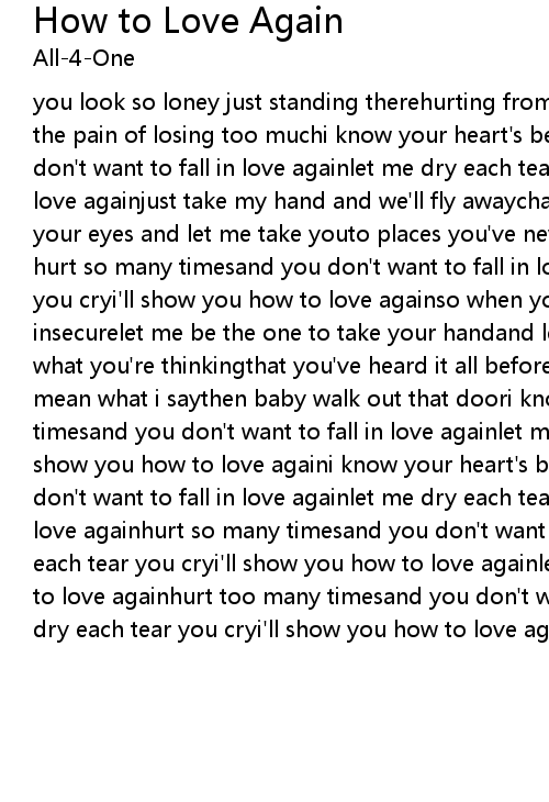 | you look so loney just standing therehurting from loveyou smile but cannot hide the pain of losing too muchi know your heart's been hurt so many timesand you don't want to fall in love againlet me dry each tear you cryi'll show you how to love againjust take my hand and we'll fly awaychase all our dreamsjust close your eyes and let me take youto places you've never seeni know your heart's been hurt so many timesand you don't want to fall in love againlet me dry each tear you cryi'll show you how to love againso when you're feeling strange, afraid or insecurelet me be the one to take your handand leave you safe and warmi know what you're thinkingthat you've heard it all beforeand if you don't believe i mean what i saythen baby walk out that doori know your heart's been hurt so many timesand you don't want to fall in love againlet me dry each tear you cryi'll show you how to love againi know your heart's been hurt so many timesand you don't want to fall in love againlet me dry each tear you cryi'll show you how to love againhurt so many timesand you don't want to fall in love againlet me dry each tear you cryi'll show you how to love againlet me dry each tear you cryhow to love againhurt too many timesand you don't want to fall in love againlet me dry each tear you cryi'll show you how to love again |