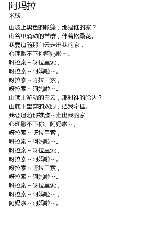 | [03:59.080] | ya lā suǒ ā mā la, |