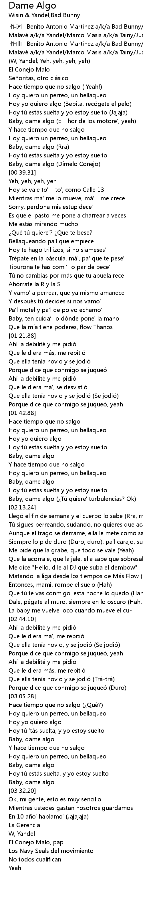 | [00:00.000] | zuò cí : Benito Antonio Martinez a k a Bad Bunny Llandel Veguilla Malavé a k a Yandel Marco Masis a k a Tainy Juan Luis Morera a k a Wisin |