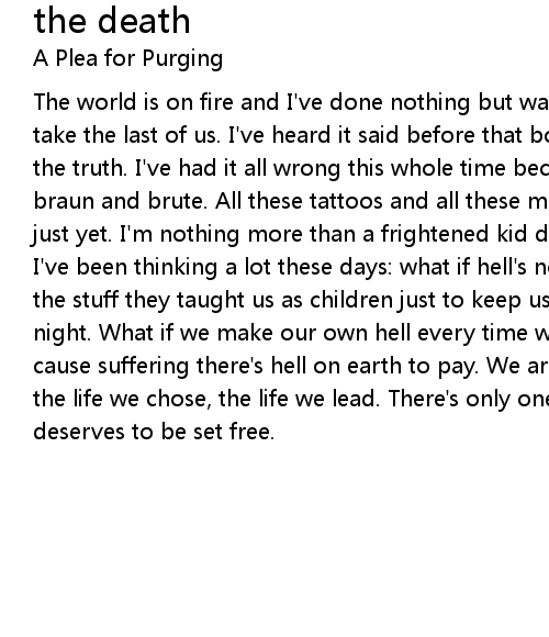 The world is on fire and I've done nothing but watch it burn and soon it will take the last of us. I've heard it said before that boys play games and men live the truth. I've had it all wrong this whole time because I thought it was all braun and brute. All these tattoos and all these miles haven't made me a man just yet. I'm nothing more than a frightened kid demanding undeserved respect. I've been thinking a lot these days: what if hell's not all fire and devils? All the stuff they taught us as children just to keep us scared and wondering at night. What if we make our own hell every time we cause pain? Every time we cause suffering there's hell on earth to pay. We are all murderers here. This is the life we chose, the life we lead. There's only one guarantee here. None of us deserves to be set free. |