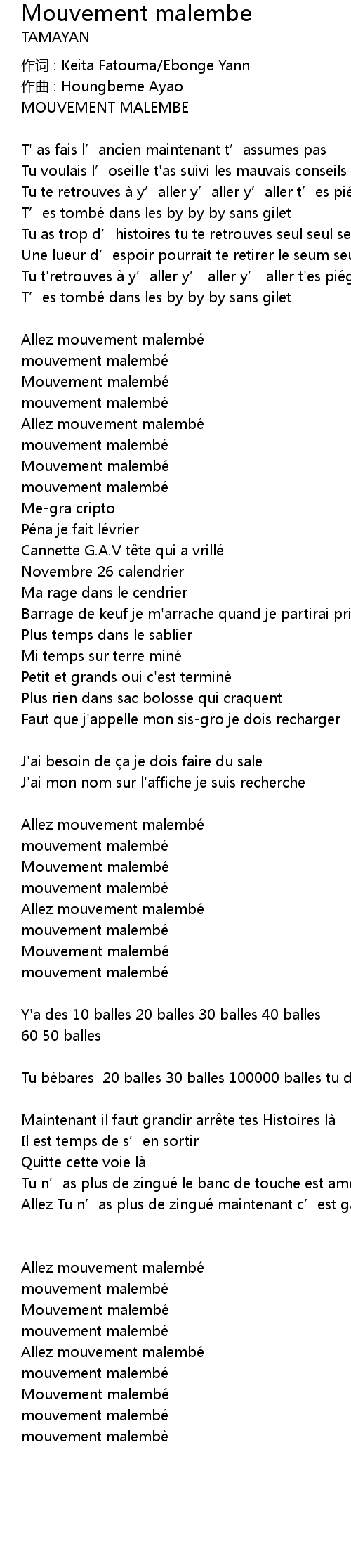 | 作词 : Keita Fatouma/Ebonge Yann | |