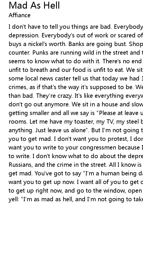 yell: "I'm as mad as hell, and I'm not going to take this anymore!" |