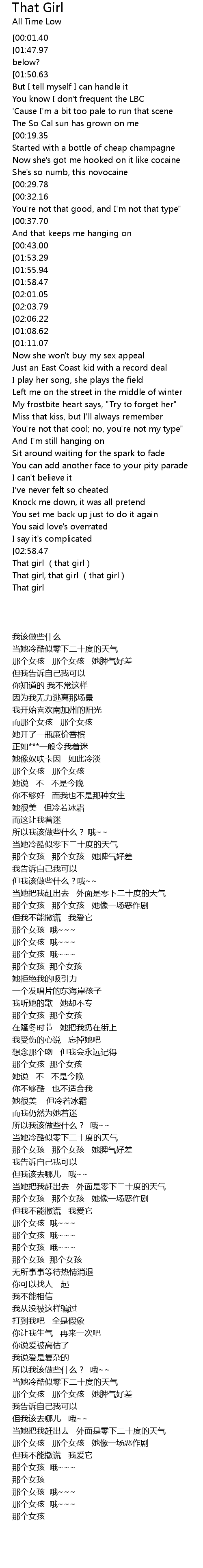 | [03:03.56][02:58.47] | That girl, uh oh uh oh (that girl) |