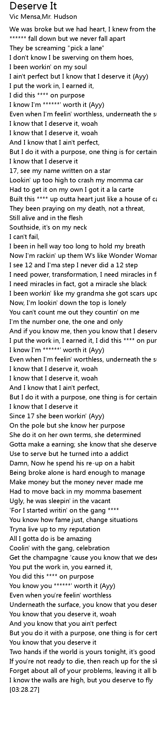 | [01:33.44] | I put the work in, I earned it, I did this **** on purpose |