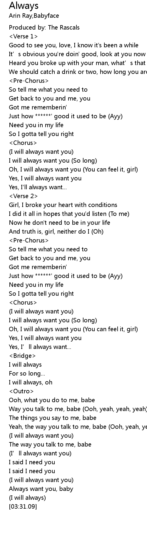 | [03:22.64] | Always want you, baby |