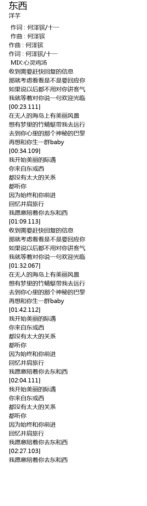 | [02:23.107] | 我愿意陪着你去东和西 |