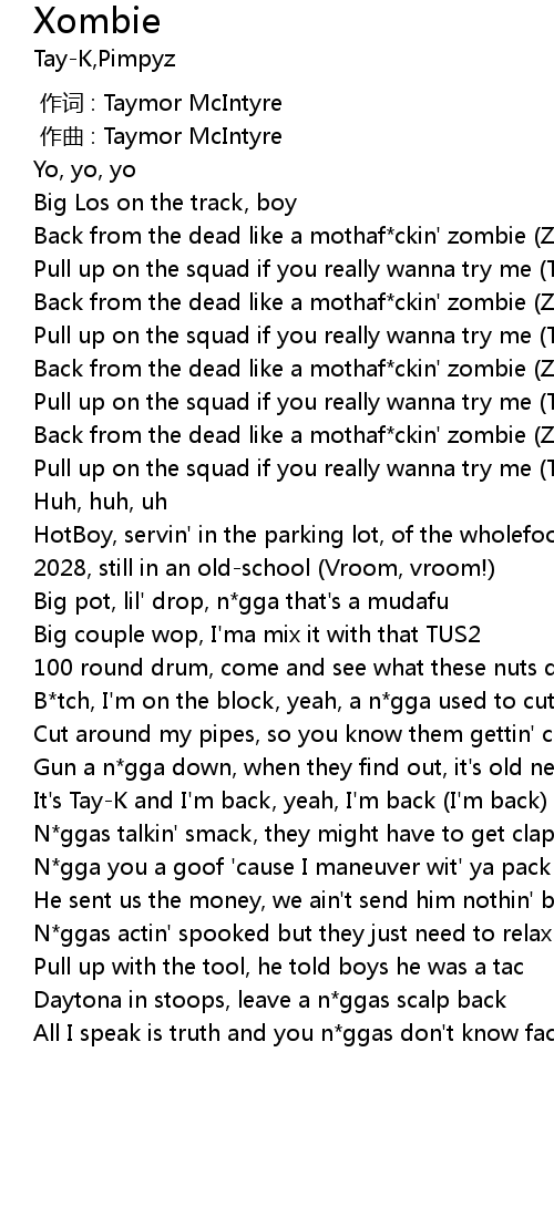 | [00:43.17] | Back from the dead like a mothaf*ckin' zombie (Zombie) |