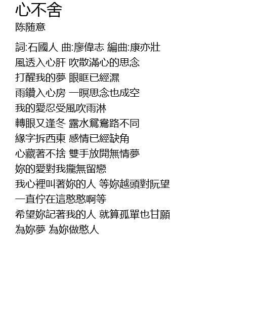 | 詞:石國人 曲:廖偉志 編曲:康亦壯 | |