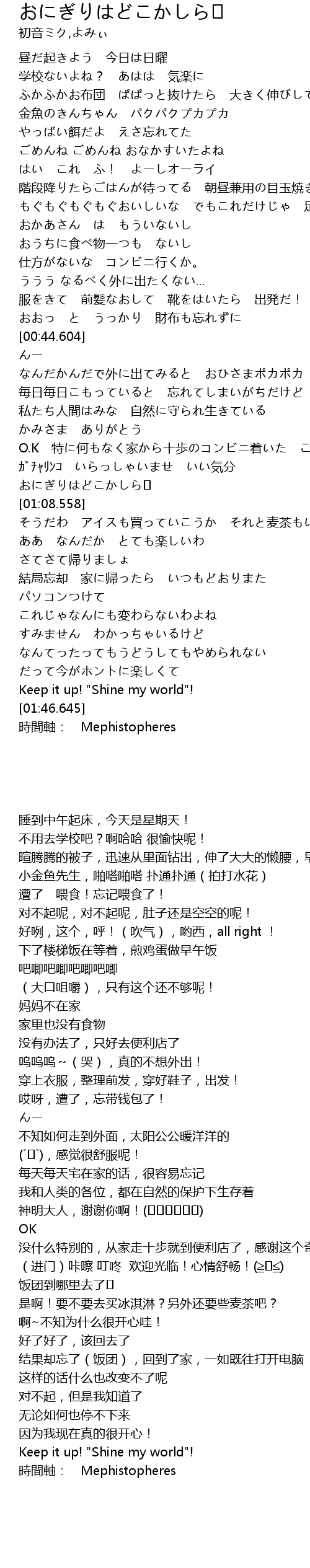 | [01:42.256] | Keep it up! " Shine my world"! |