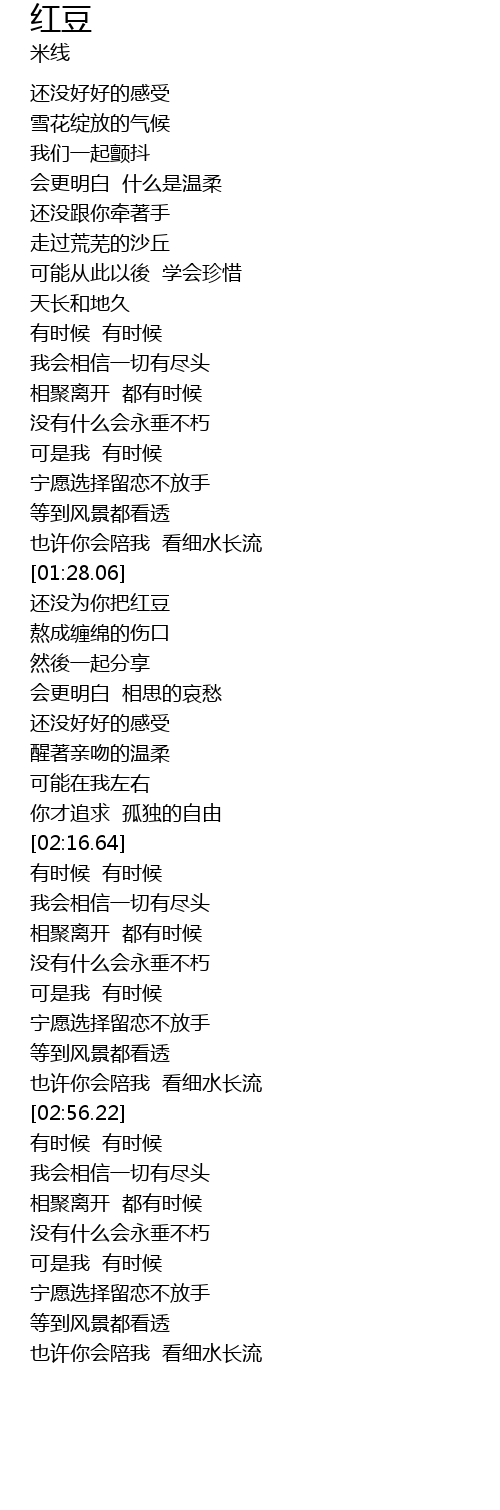 | [01:40.13] | hái méi wèi nǐ bǎ hóng dòu |