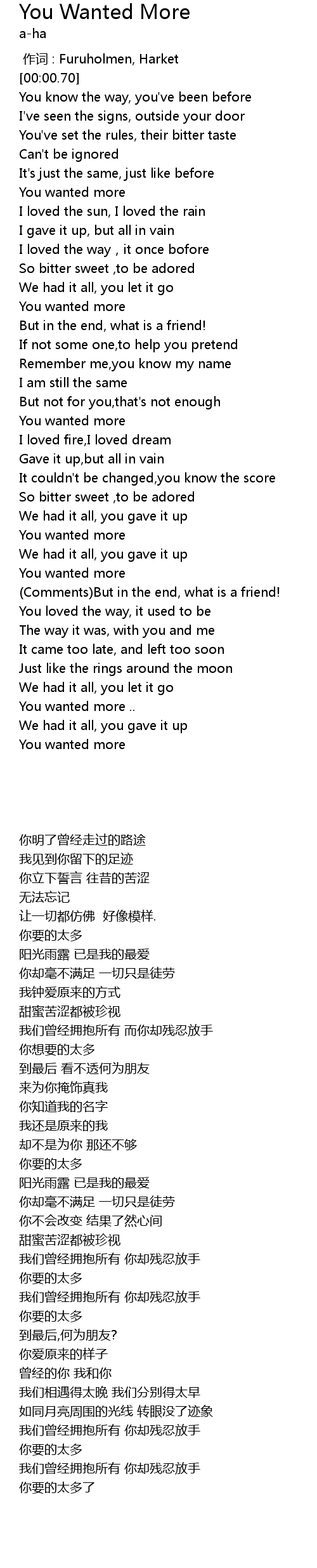 | [00:00.00] | 作词 : Furuholmen, Harket |