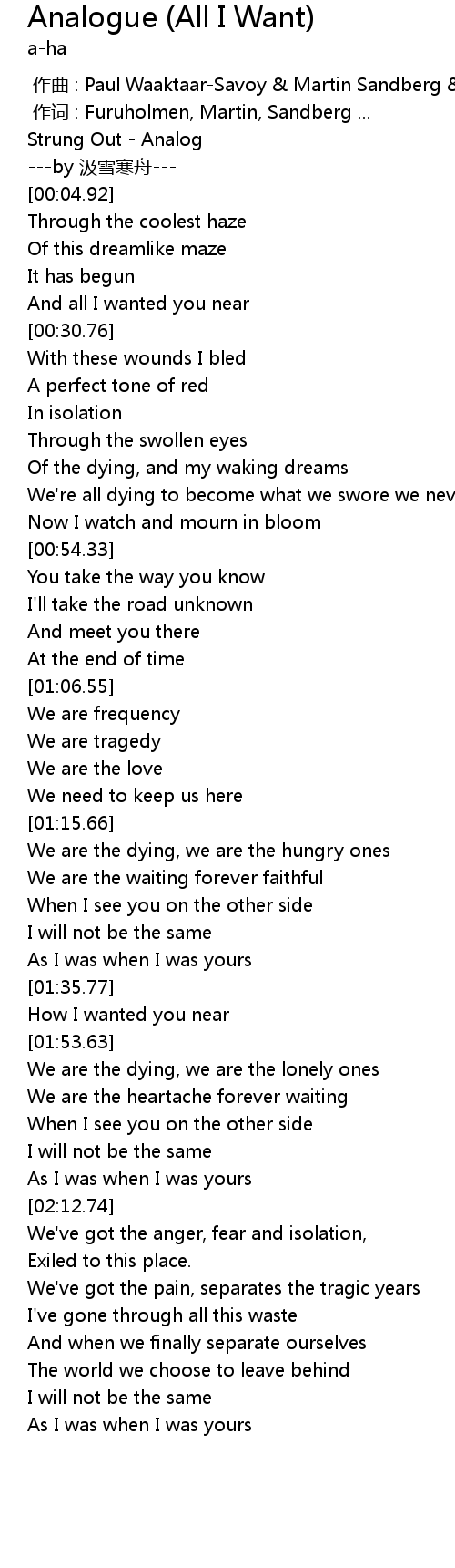 | [00:00.00] | 作曲 : Paul Waaktaar-Savoy & Martin Sandberg & Magne Furuholmen |