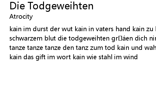 | kain im durst der wut kain in vaters hand kain zu blind zu stehn kain aus schwarzem blut die todgeweihten grá en dich nimm dein schwert und tanze tanze tanze tanze tanze den tanz zum tod kain und wahn zum wahn kain du sá es licht kain das gift im wort kain wie stahl im wind |