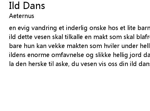| en evig vandring et inderlig onske hos et lite barn et mektig barn et avkom av ild dette vesen skal tilkalle en makt som skal blafre i nordens mektige storm bare hun kan vekke makten som hviler under hellig jord hun vil danse i vind og i ildens enorme omfavnelse og slikke hellig jord dans i ilden la ilden stige opp la den herske til aske, du vesen vis oss din ild dans |