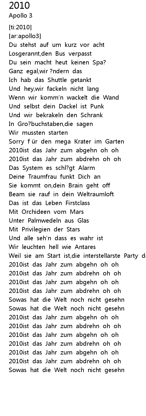 | [01:36.38] | 2010ist das Jahr zum abgehn oh oh |