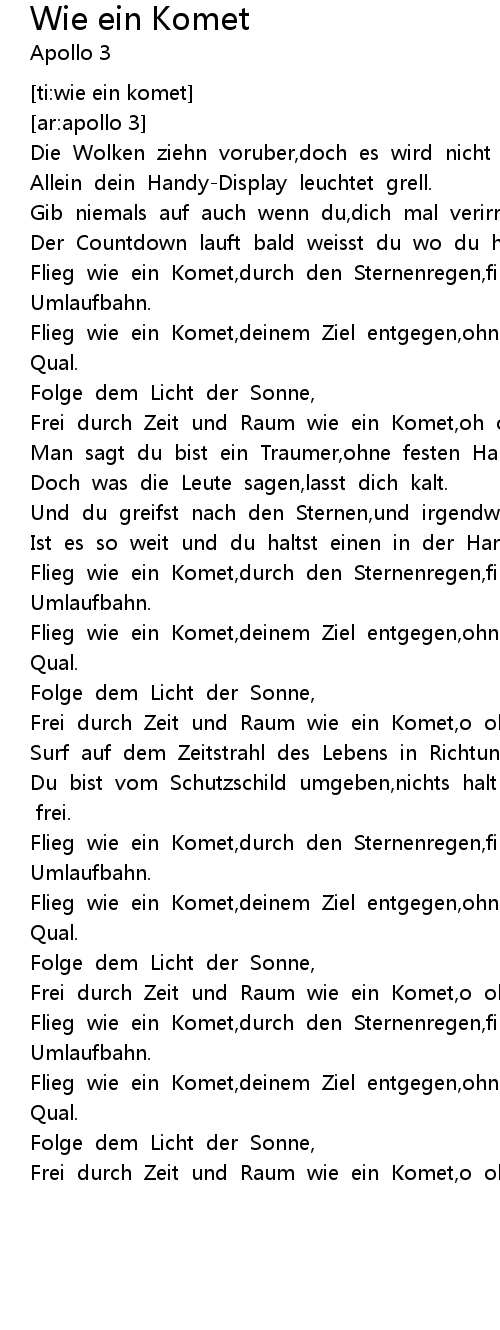 | [03:40.74] | Flieg wie ein Komet,deinem Ziel entgegen,ohne Angst und ohne Qual. |