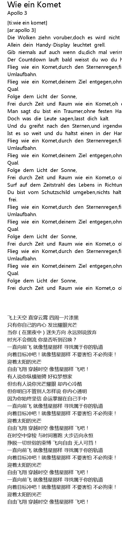 | [03:02.27] | Flieg wie ein Komet,durch den Sternenregen,finde deine Umlaufbahn. |