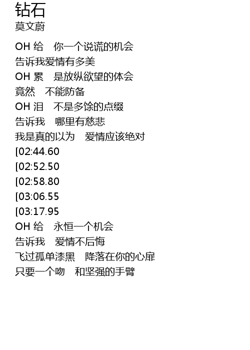 | [01:22.29][02:44.60][03:31.20] | 只要一个吻 有钻石般的美 |