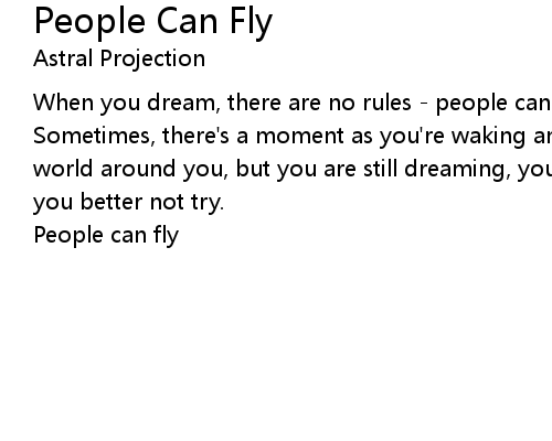 | Sometimes, there's a moment as you're waking and you become aware of the real world around you, but you are still dreaming, you may think you can fly - but you better not try. | |
