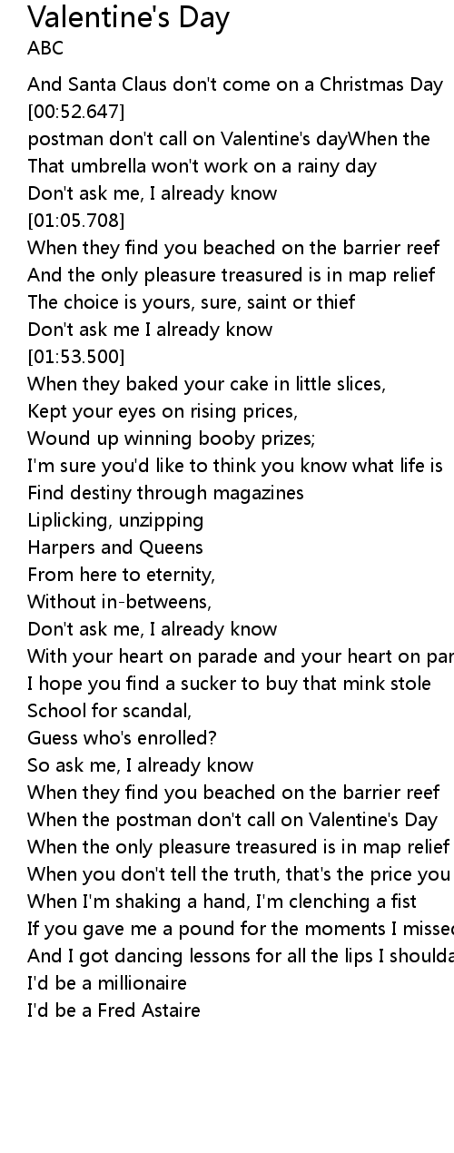 | [00:53.297] | postman don' t call on Valentine' s dayWhen the |