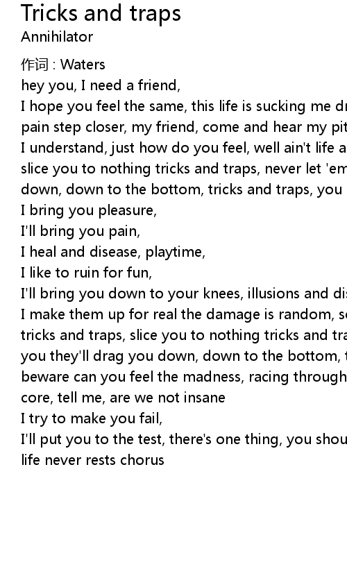 | I understand, just how do you feel, well ain't life a bitch tricks and traps, slice you to nothing tricks and traps, never let 'em get to you they'll drag you down, down to the bottom, tricks and traps, you better beware | |