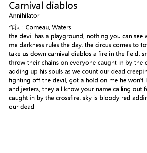 | the devil has a playground, nothing you can see wickedness disguised for you and me darkness rules the day, the circus comes to town slowly riding in, come to take us down carnival diablos a fire in the field, smoking out the sun minions throw their chains on everyone caught in by the crossfire, sky is turning red adding up his souls as we count our dead creeping, sneaking, he tries to deceive fighting off the devil, got a hold on me he won't let me leave freaks, thieves and jesters, they all know your name calling out for you to play their game caught in by the crossfire, sky is bloody red adding up his souls as we count our dead |