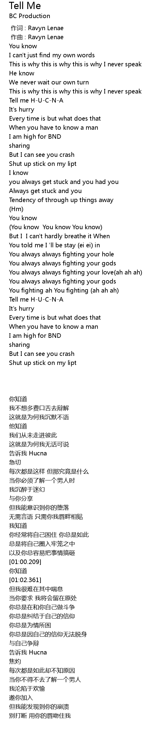 | [01:36.104] | Tell me HUCNA |