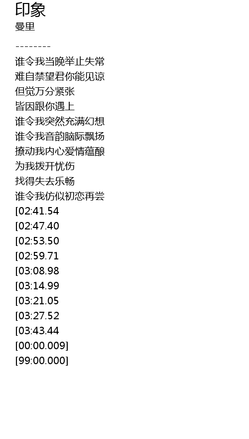 | [01:30.72][02:47.40] | 怎许相依恋 永远心相向 |