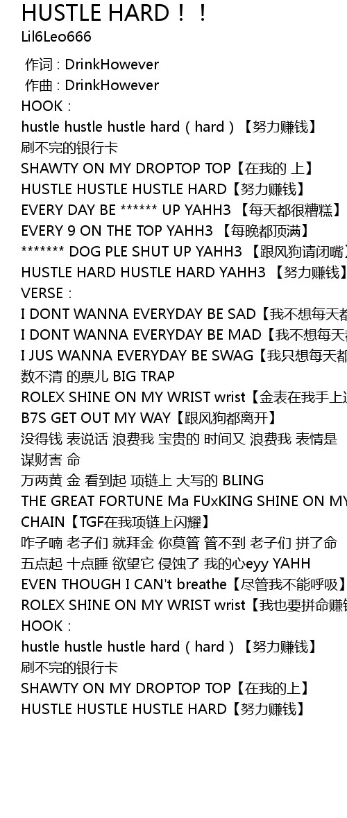| [00:51.958] | HUSTLE HARD HUSTLE HARD YAHH3 nu li zhuan qian |