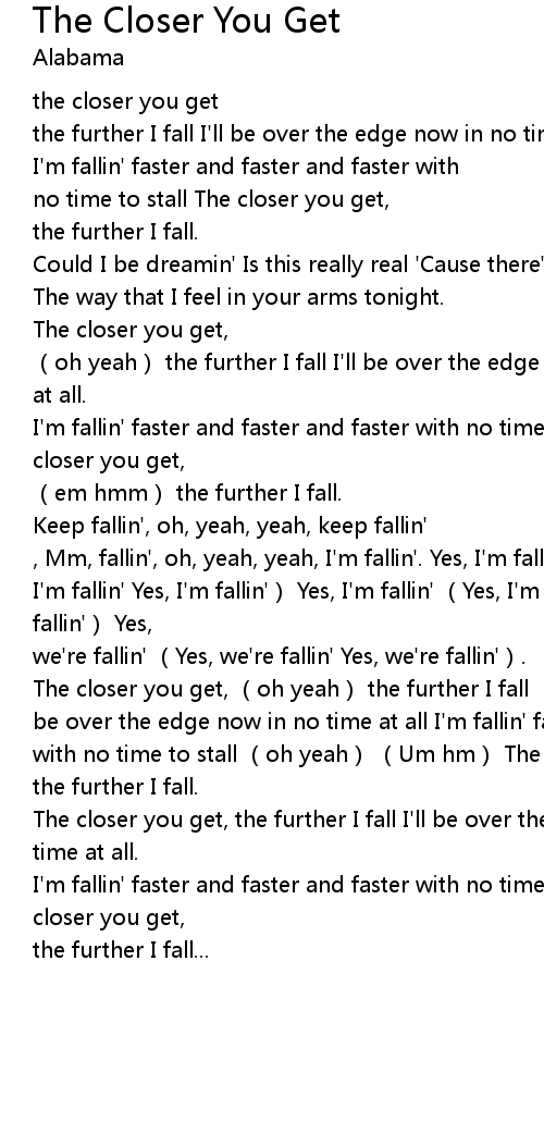 | [02:32.03] | The closer you get, (oh yeah) the further I fall (um hmm) I'll be over the edge now in no time at all I'm fallin' faster and faster and faster with no time to stall (oh yeah) (Um hm) The closer you get, (em hmm) the further I fall. |