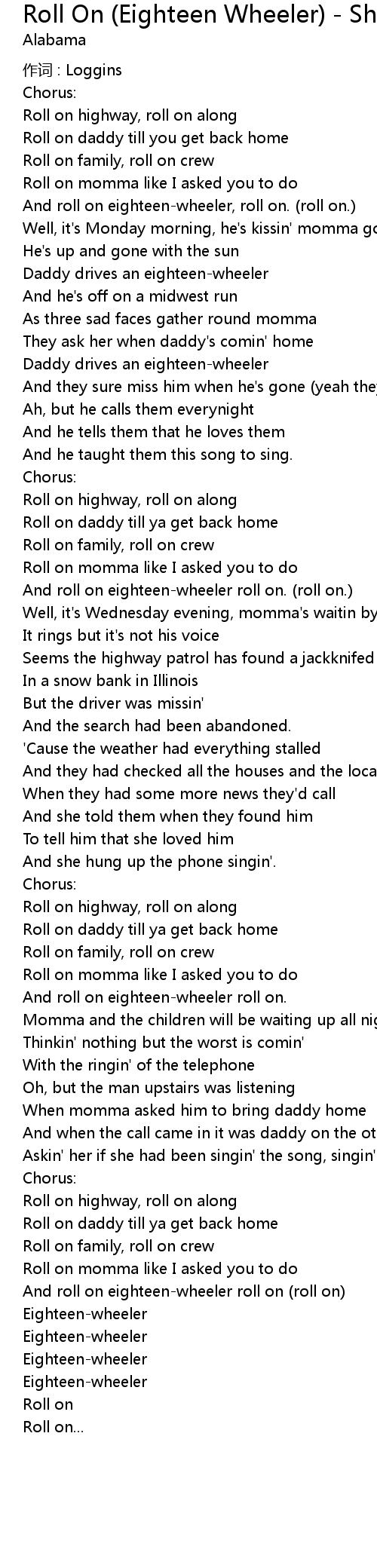 | And roll on eighteen-wheeler roll on. (roll on.) | |
