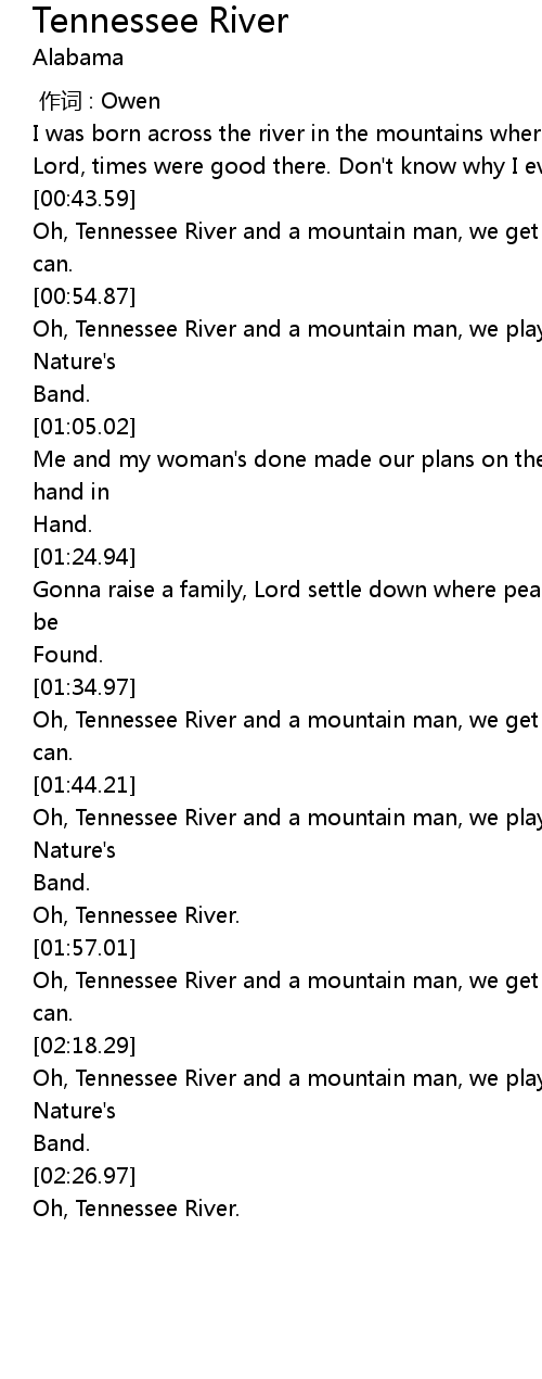 | [00:56.31] | Oh, Tennessee River and a mountain man, we play together in Mother Nature's |